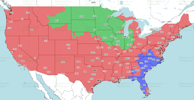 Jaguars game will be broadcast on fox in regions throughout the country, denoted in blue in the map above.